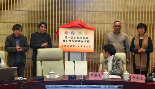 致辞结束后,郝宇青、俞慰刚、詹丹、王英四位老师一起为大赛揭牌,拉开了第一届上海肆大杯研究生学术沙龙大赛的大幕。