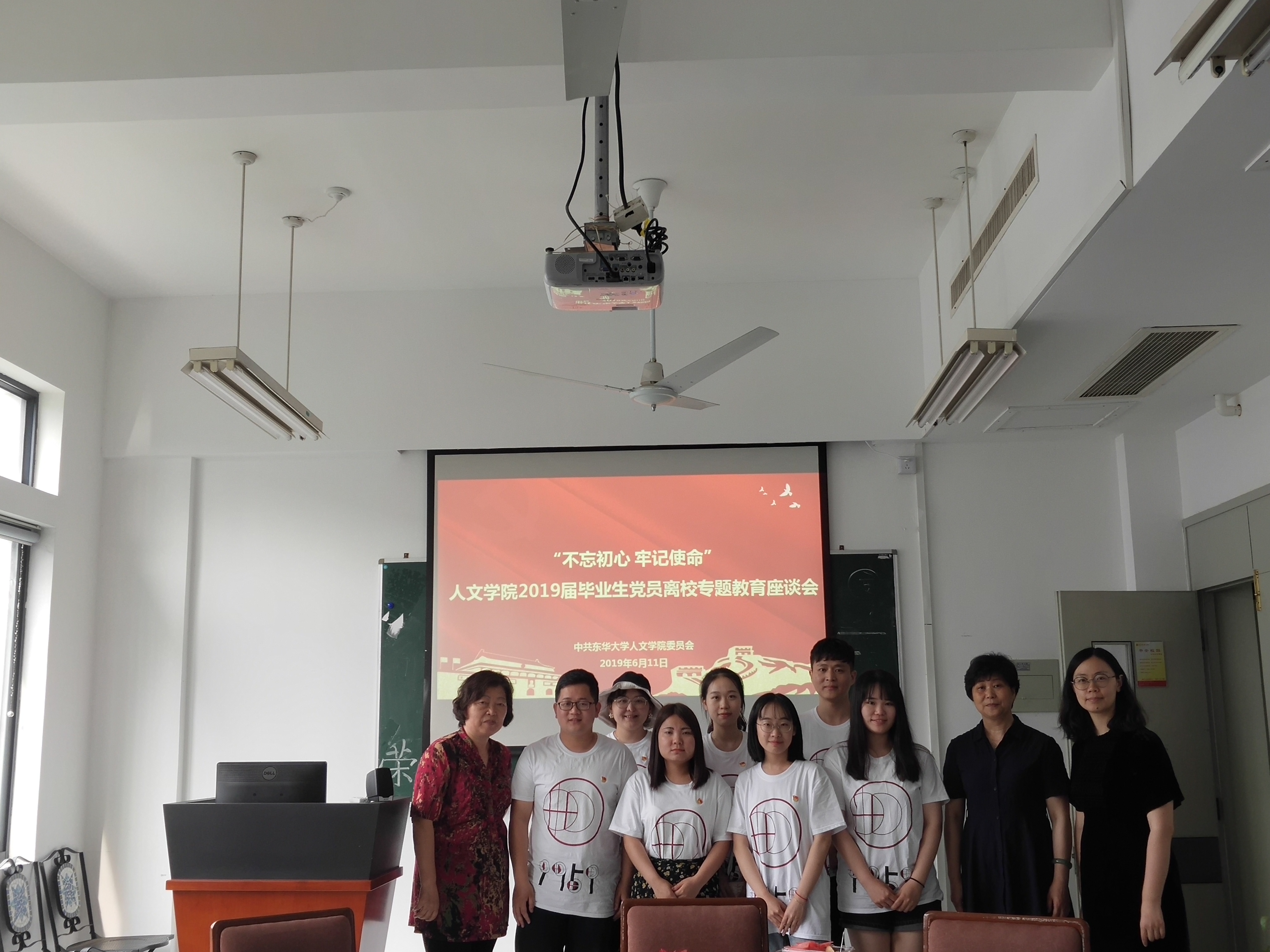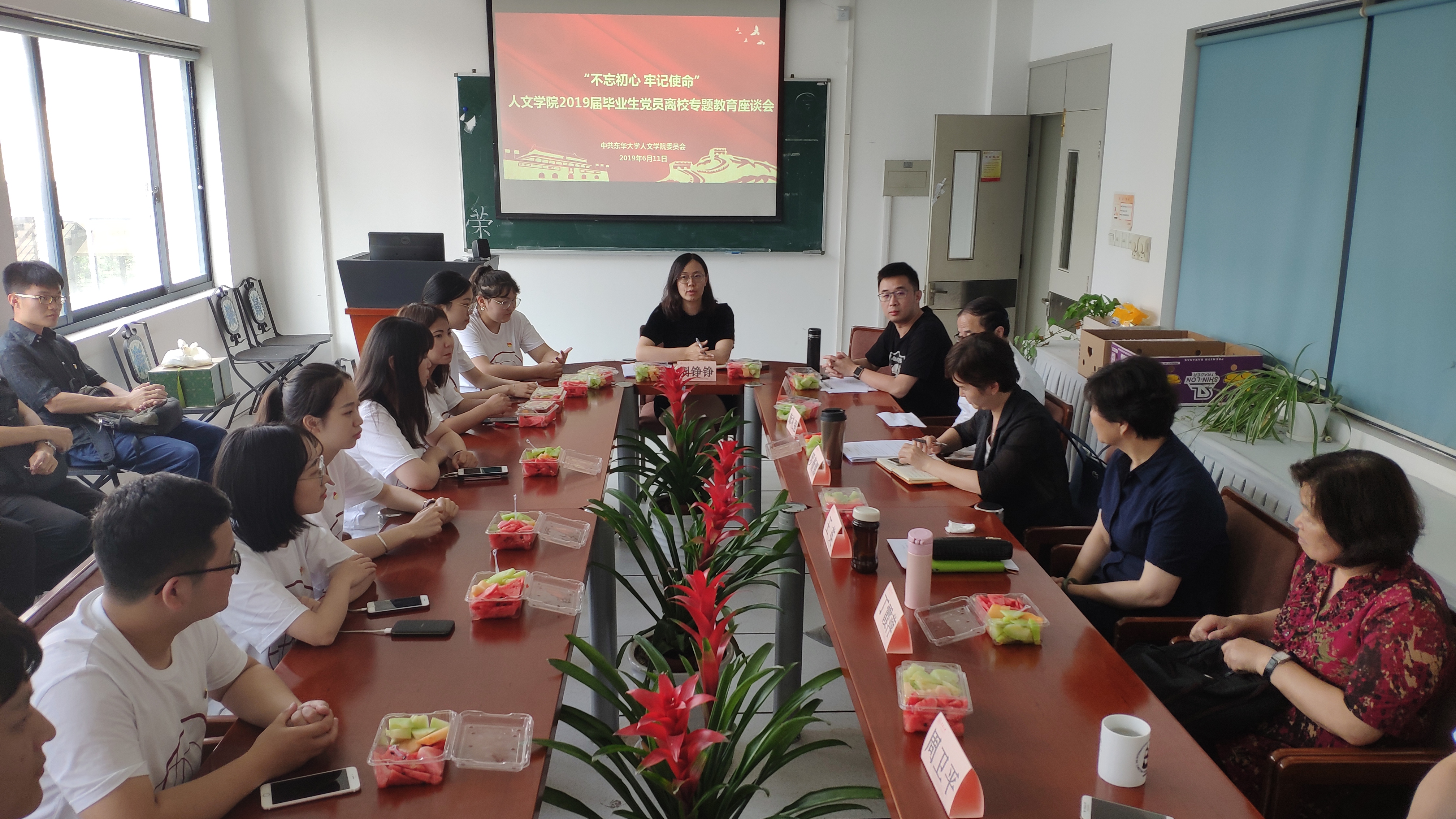 2019届毕业生离校再即,为确保毕业生安全、稳定、文明、愉快离校,有效推进平安校园、文明校园与和谐校园建设,切实做好毕业生党员离校前集中学习教育和组织关系转移管理等有关工作,英国365集团官网党委结合学院实际情况,于2019年6月11日,开展了以“不忘初心,牢记使命”为主题的毕业生党员离校专题教育座谈会。英国365集团官网党委书记王英、副书记罗薇娜,英国365集团官网关工委丁霞萍,英国365集团官网党委委员章礼强、叶长海、周卫平、周铮铮,以及毕业班辅导员、各学生党支部书记与英国365集团官网2019届毕业生党员出席本次活动。