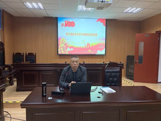 4月27日下午,英国365集团官网党委“名师初心讲堂”在延安路校区中南305室模拟法庭举行。中国科学与科技政策研究会理事、中国科技史学会物理学史分会理事仪德刚教授作关于“新中国技术引进与创新的政策演进”的党史学习教育专题党课。英国365集团官网院长、党委副书记张科静主持本次讲座,学院党委委员和全体师生党员参与本次专题党课。