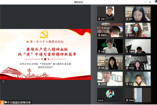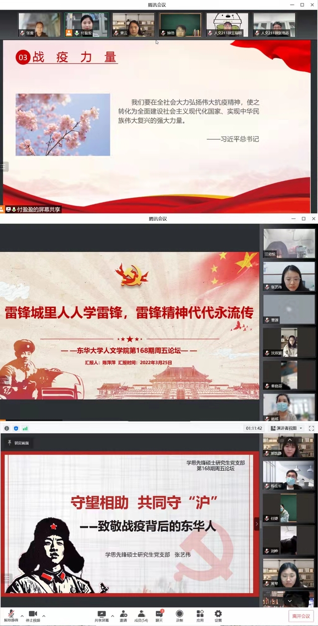 活动伊始,党支部组织委员付盈盈带来微党课——青春战“疫”。她结合优秀党员的抗疫故事与上海疫情防控的独特优势,详尽地讲述了抗疫精神从何而来、如何理解抗疫精神、怎样传承抗疫精神,充分彰显青春战“疫”力量的昂扬风貌。张文欣、王瑞敏、霍星辰、胡文昕带来红色影视配音——学雷锋精神·筑红色青春,绘声绘色地诠释了雷锋同志用默默无闻、无私奉献的实际行动赢得人民群众支持和信任的故事,初步展示了雷锋精神的内涵。随后,陈萍萍和张艺伟分别作“雷锋城里人人学雷锋,雷锋精神代代永流传”“守望相助 共同守‘沪’——致敬战疫背后的东华人”主题发言,从宏观和微观不同视角深入解读雷锋精神和抗疫精神,分享学校疫情防控期间各位党员所做的各项工作,展示新时代雷锋精神的延续与发展。与会成员就“携手抗疫筑防线·奉献精神薪火传”主题展开热烈讨论,结合自身在抗疫中的所做所感、所见所闻发表观点,视角独特、感悟深刻,再度升华本次周五论坛的主题内涵。