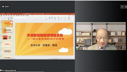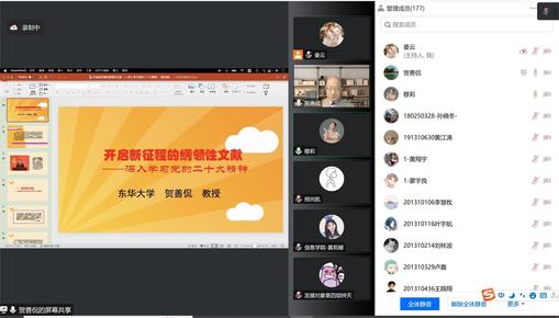 贺善侃教授从“鲜明的主题”、“非凡的成就”、“新思想的引领”、“新时代新征程的新使命”、“庄严的承诺”五个角度深刻阐释了党的二十大的会议内容及会议精神。贺善侃指出,党的二十大系统梳理和深刻总结了党的十八大以来非凡十年的重大成就与重要经验,学习贯彻党的二十大精神是当前和今后一段时期的首要政治任务。贺善侃着重向阐述了党在新征程上举什么旗、走什么路、以什么样的精神状态、朝着什么样的目标继续前进,层层深入,逐步递进,勾画了中国社会主义现代化在关键期实现全面突破的总体纲领和“基本施工图”。