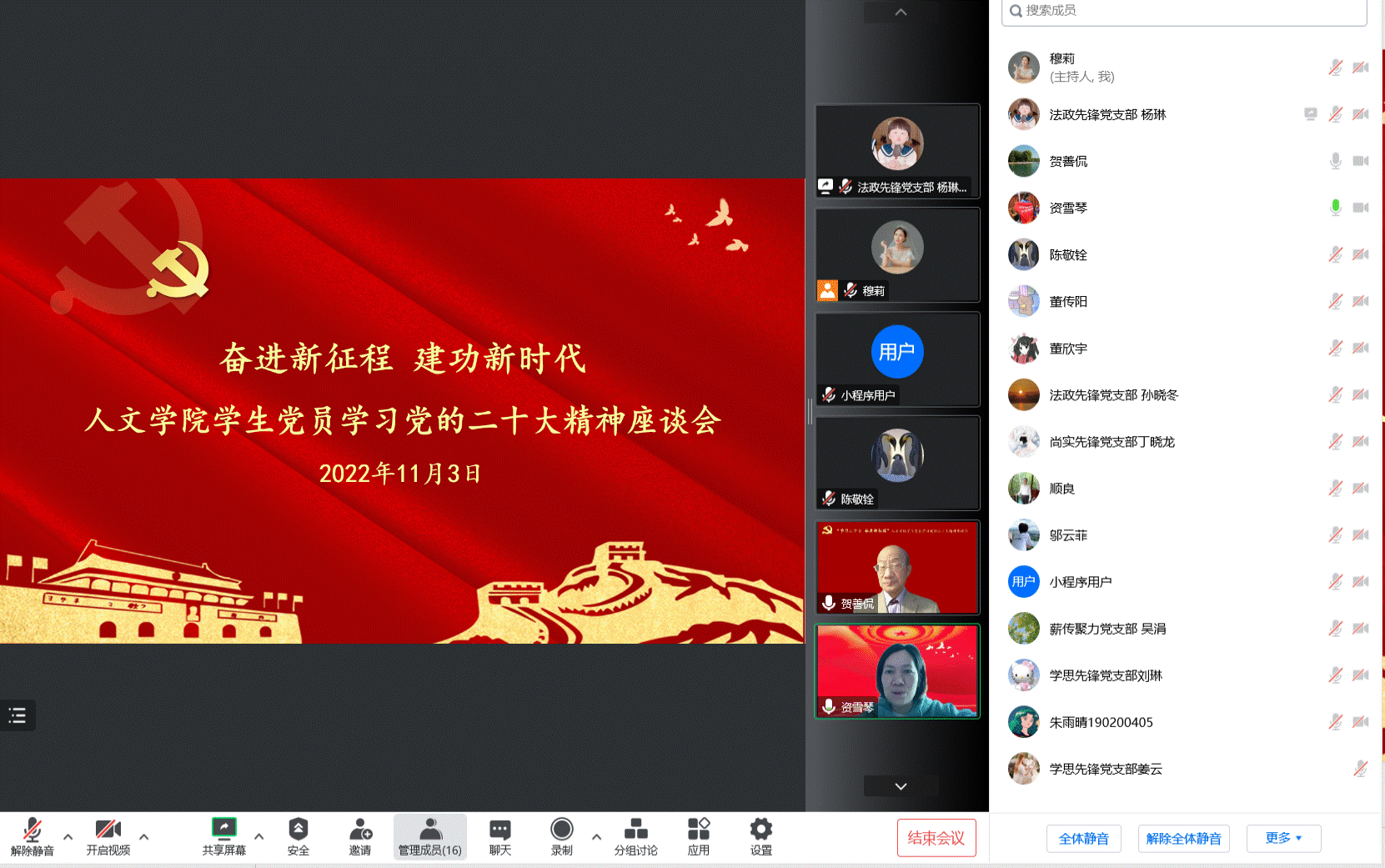 资雪琴在主持中指出,将通过专家辅导报告、专题学习研讨、理论宣讲会、红色足迹寻访等形式多样、内涵丰富的活动,继续引导学生深入学习党的二十大报告。与会党员纷纷表示,党的二十大是一次高举旗帜、凝聚力量、团结奋进的大会,大家将把深入学习宣传贯彻党的二十大精神,作为当前和今后一个时期的首要政治任务,用先进的思想理论武装头脑,不断提高思想认识,坚定理想信念,掌握专业知识,指导学习、工作和实践,切实将理论学习成果化为勇毅前行的不竭动力,不断增强志气、骨气、底气。