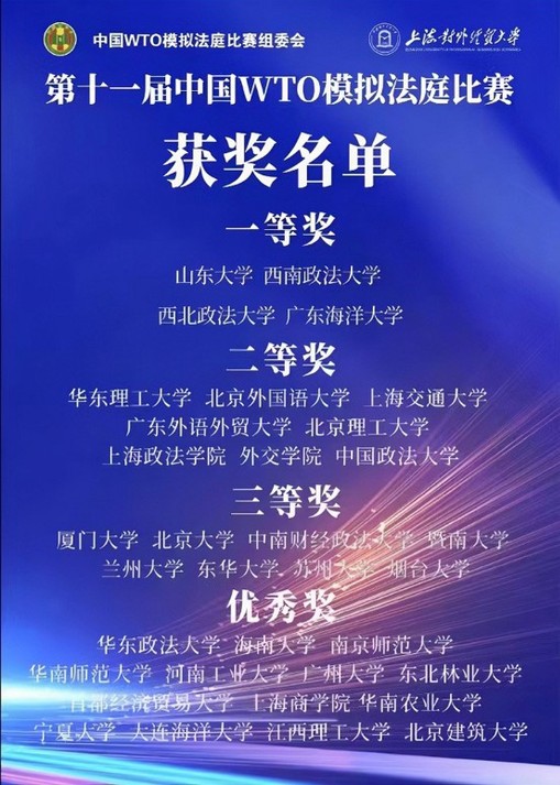 2022年11月26-27日,由国家商务部、中国法学会等联合主办的第十一届“中国WTO模拟法庭比赛”在线上隆重举行。参赛队伍既有来自北京大学、上海交通大学、中山大学、厦门大学等国内顶尖的“985”院校、也有中国政法大学、华东政法大学等著名政法类院校。经过激烈角逐,我校代表队最终荣获本次比赛三等奖,与北京大学、厦门大学等其他7所大学并列。
