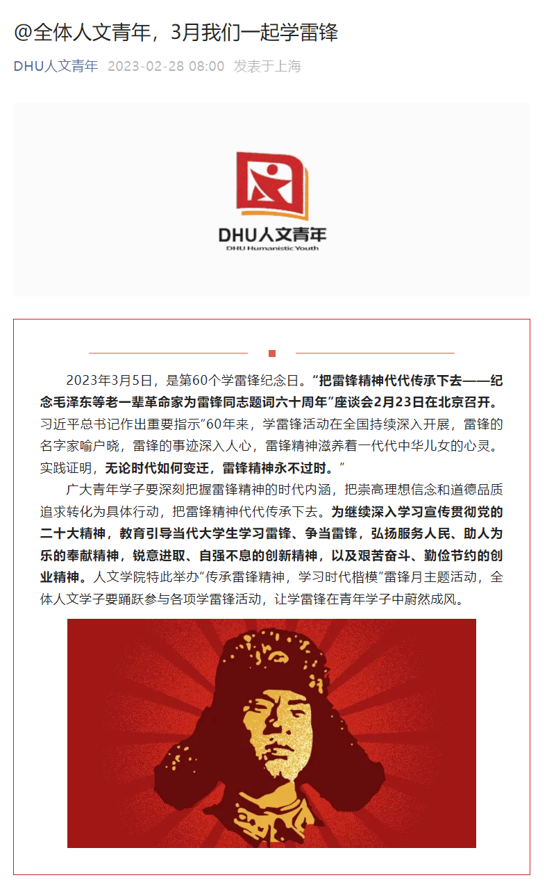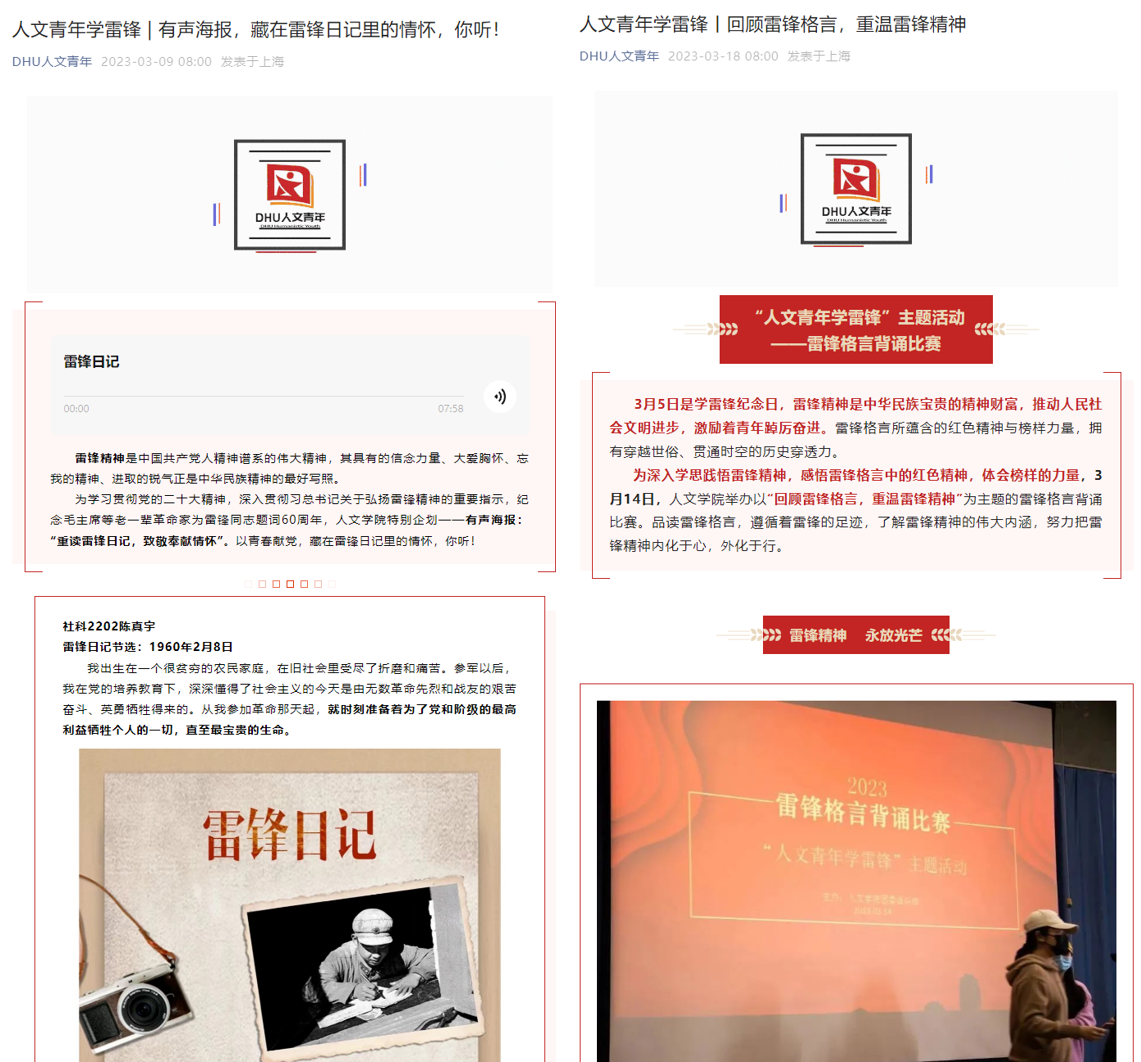 为培养人文学子的奉献精神和服务意识,展现人文青年的精神面貌和良好形象,提高学生志愿服务的参与力度和参与效能,继承和弘扬雷锋精神,英国365集团官网创新形式,开展内涵丰富的雷锋精神学习活动。成立人文予愿志愿者储备队,吸纳30名有责任心和奉献精神的成员,不断壮大学院志愿服务队伍的同时,有针对性地开展专题培训,提升志愿服务能力和服务品质。开展“有声海报:重读雷锋日记,致敬奉献情怀”“雷锋格言背诵比赛”主题活动,引导团员青年从雷锋日记、雷锋格言中感悟雷锋精神的伟大内涵,用雷锋精神陶冶情操、指导实践。此外,学院团委与天山路街道党建办、团工委积极联动,组织开展学雷锋主题座谈交流会,与上海市人大代表、长宁区党代表面对面,倾听老一辈中的雷锋精神,感悟时代洪流中不变的中华传承。学思先锋硕士研究生第一、第二党支部,薪传聚力党支部、法政先锋党支部通过开展“让‘雷锋精神’闪耀时代光芒”和“雷锋精神历久弥新,青年初心矢志不渝”专题学习会,以及“学习雷锋精神”主题观影活动,引导党员同学强化理论学习,深化对雷锋精神内涵的理解与把握。