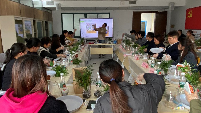 农林学院智工系学生党支部党员代表围绕绿植养护、微景观设计等话题,向与会党员作发挥专业优势开展创新创业的经验分享,并带领与会党员进行铺沙石、培土、移栽、装饰等一系列操作,完成个人微景观设计。