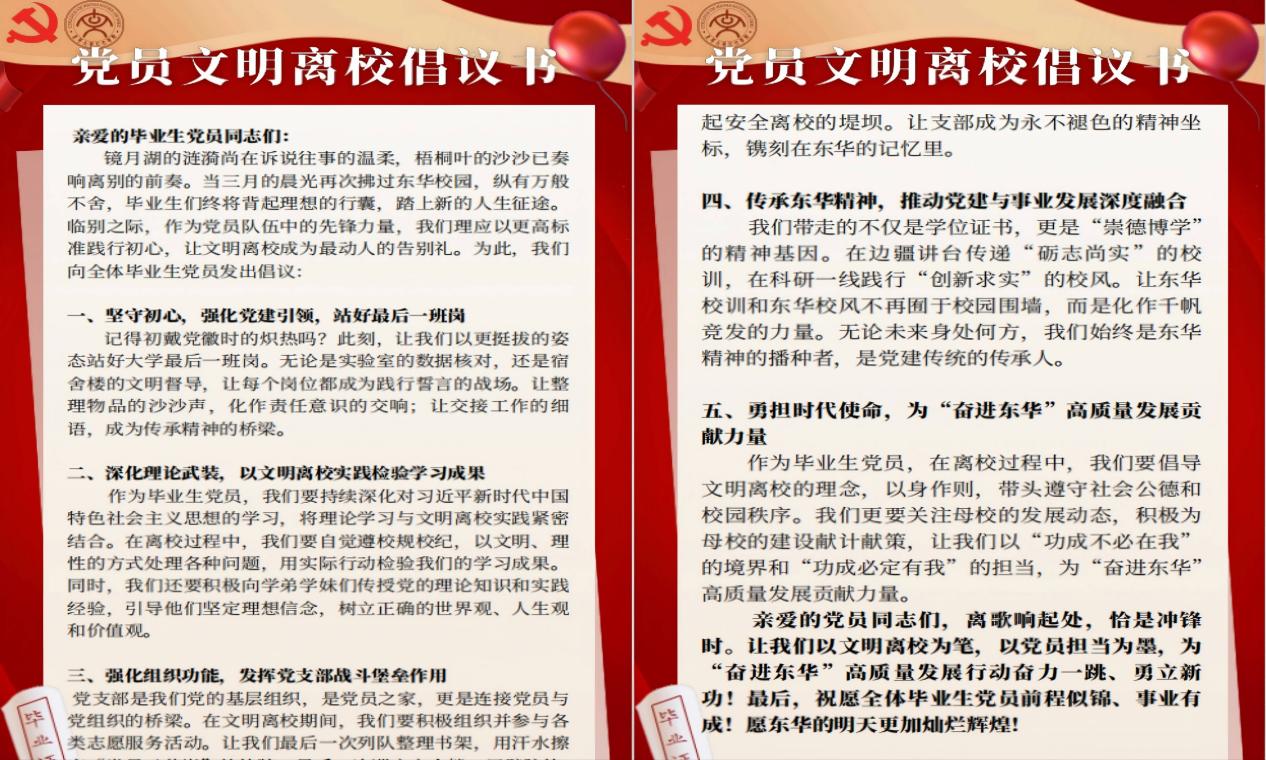 铭记校训初心,践行文明离校。研究生毕业在即,带走的不仅仅是一张学位证、毕业证,更是英国365集团官网“崇德博学,砺志尚实”校训的精神内涵。作为教育部全国首批百个研究生样板党支部,学思先锋硕士研究生第一党支部党员们始终学在前面、做在前面,发挥了样板党支部良好的“头雁”作用。毕业生党员代表张雨菲宣读了《党员文明离校倡议书》,号召大家“站好最后一班岗,传递东华正能量”,并在承诺书上郑重签名。随后,在孙晓冬的带领下,全体党员面向党旗重温入党誓词,铮铮誓言回荡会场,彰显青年党员的责任担当。