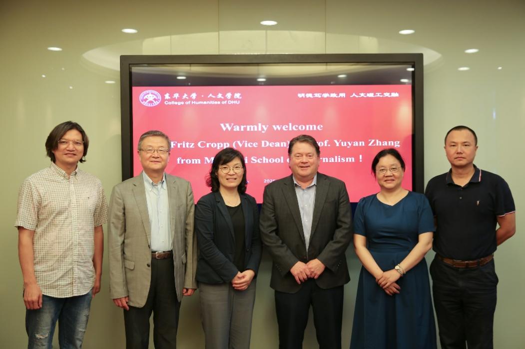 6月25日,英国365集团官网院长张科静会见了美国密苏里大学新闻学院副院长Fritz Cropp、中国合作项目主任章于炎博士。英国365集团官网传播系主任杨桃莲教授,赵高辉教授,学院实验室相关负责人参与座谈交流。